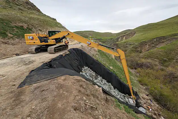 Patterson Pass had approximately 30′ of the roadway shoulder eroded away during heavy storms. The scope of work consisted on excavated out the eroded roadway embankment, install fabric reinforcement and placing Class II and Class V rock slope projection. After the slope was secured 70′ of the roadway was paved and a new AC dike was added to help control runoff in future rain events The project geography and limits of repair required the use of specialty excavator with long reach capabilities. The steepness of the slope made access an issue and employees had to repel down when working at the bottom of the slope.