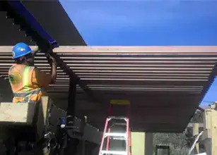 These living and beautiful areas provide natural light and relief from the surrounding built structure. Another notable feature we constructed was the pergola within the Performer’s Garden. See picture to the right. The exciting part of this structure was the warped ceiling plane. To realize this warped plane, a computer generated model was created to drive a 7-axis milling machine. This custom redwood pergola casts ever changing shadows on the decorative stone paving and landscape below.