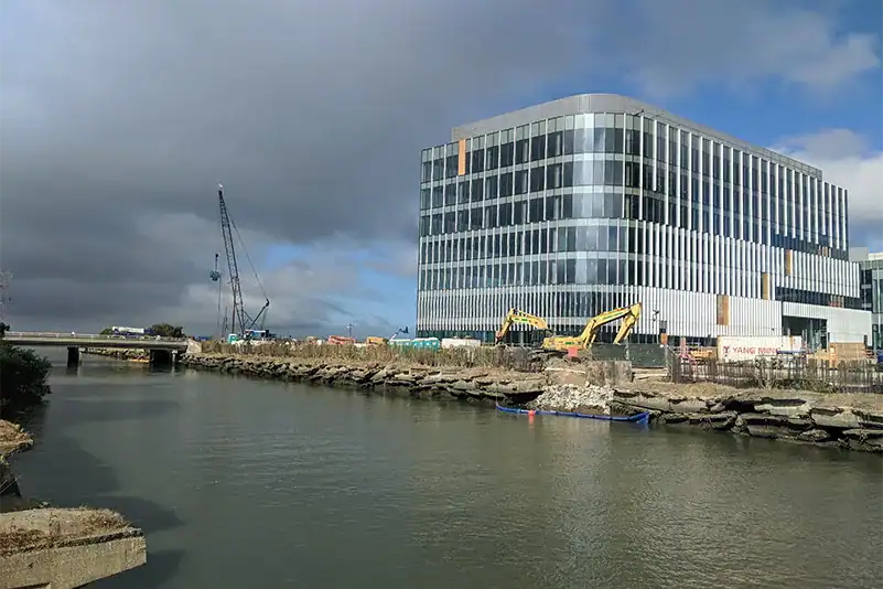 Burlingame Point is a progressive commercial development built on waterfront land that used to be the home of the Burlingame Drive In that was closed and demolished in the early 2000’s. The 18.13 acre site consists of 4 office buildings, a 5 level parking garage, and a 2 level Amenity building. This project is not only one of the largest office developments in the San Francisco Bay Area, but will provide improved public access to the San Francisco Bay and Sanchez Channel that includes beautifully landscaped walking paths and open plazas. Facebook was so intrigued by the design and community aspects of this project that they signed a lease for the entire complex prior to construction completion.