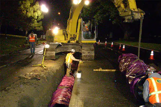The project area was fairly extensive including 7.5 miles of piping ranging from 30” at the treatment plant, to 6” at the branch locations. Except at the actual connections to customers, the entire pipeline was installed in city streets. Due to the high volume of daytime vehicular, bicycle and pedestrian traffic, much of the pipe was installed at nights when much of the commercial district was closed. This was a safety measure McGuire and Hester took, which equally helped reduce the project’s impact on the neighboring businesses.