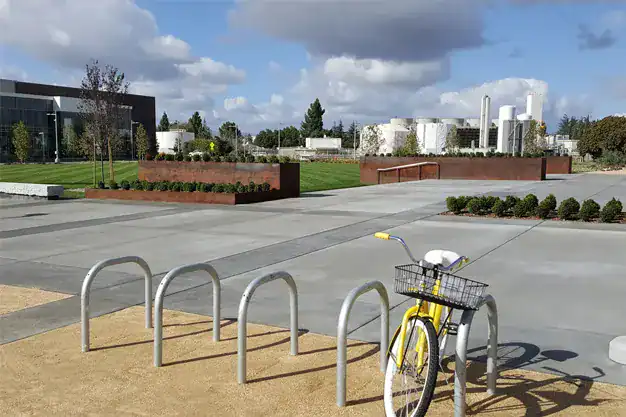 McGuire and Hester was awarded the landscape scope of this package which includes specimen Palm trees, planting, two-wire irrigation, biotreatment basins, subdrains, decomposed granite paving, CorTen steel planters, concrete unit pavers, bike lockers and racks, lighted handrails and a guard shack.