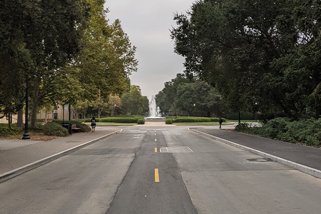 Jane Stanford Way is the historic thoroughfare that runs through the heart of Stanford University. It is a pedestrian walking mall and the main bus/emergency vehicle route adjacent to several notable buildings, including Hoover Tower, Main Quad, and Memorial Auditorium.