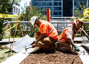 The plants and trees were then moved to a nursery in Sunol where specialists from McGuire and Hester cared for them until they were ready for delivery to the rooftop park. In addition to landscape work, McGuire and Hester crews performed decorative and architectural concrete work that included the construction of grey water basin walls, custom fountain walls, and pedestrian pathways throughout the recreational public park.