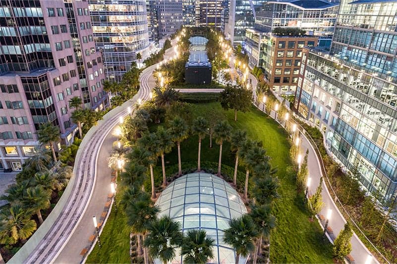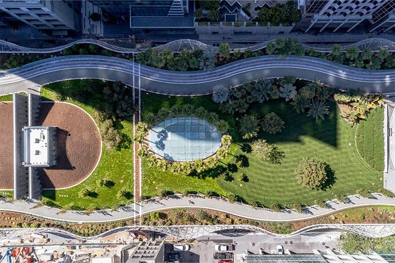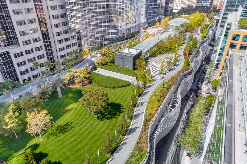 McGuire and Hester was awarded the landscaping and irrigation package of the project and performed all work as a subcontractor to Webcor Obayashi Joint Venture. The scope called for the creation of a 5.4-acre rooftop park, including the planting of more than 200 species of plants all of which were procured from nurseries throughout California and Oregon.