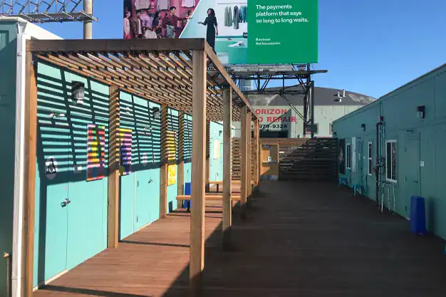 Aside from our scope, we helped the City when they were in a jam with other shelters. We built a 15 foot trellis for another shelter, plumbed gas lines into one of their buildings, and built a storage area for all 5-6 navigation centers. This 84-bed center is part of a 1,000 bed rollout by 2020.
