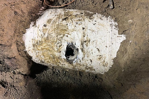 After a quick walk through with the crew, we broke ground exposing the line and dewatering before 4pm. By 7pm our crew had the pipe fully exposed and was able to determine the severity of the hit. As the day got late, the crew added light towers to the jobsite and dewatered for 3 hours until they were able to cut and patch the pipe with a welded steel buttstrap. The operation was completed with the pipe under chlorination before midnight the same day. The next morning we assisted the city in pressure testing the line and putting it back in service within 24 hours of the initial hit.