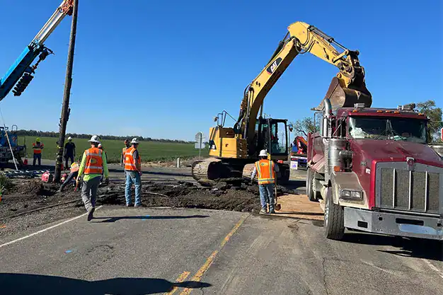 Once our emergency response team received the call, our crew was on-site coordinationg and staffing all items needed for next steps by 3:30 pm. This consisted of a crew of 7 laborers and operators on site, a 65k lb excavator, a 938 loader, super dump, trench shields, hydraulic jacks, steel plates, dewatering pumps and a rig welder with steel to make the repair ready to go.