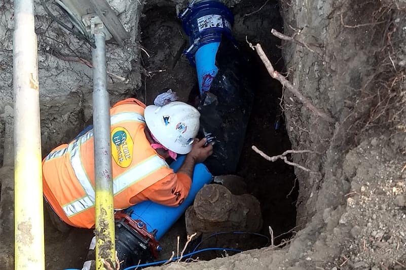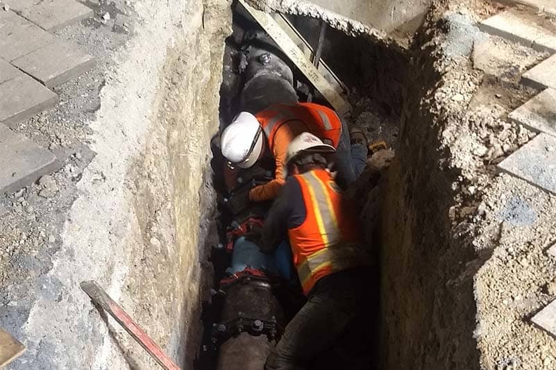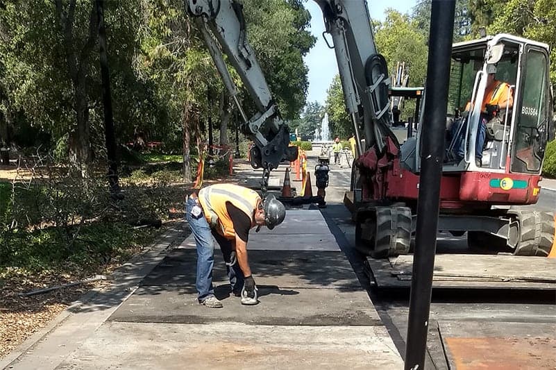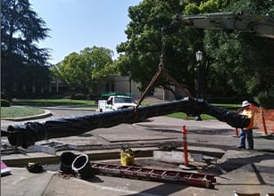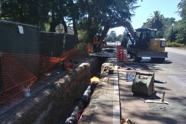 The primary challenges for this project were material availability and accelerated schedule, each of which exacerbated the other. With supply shortages happening globally due to the pandemic, it was challenging to meet Stanford’s schedule for students to move back into the dorms in early September. As material arrived at the site throughout summer, we increased the number of crews on site to make up for lost time, installing as much pipe as we had on hand. This even included a night crew coming in to assist when there weren’t enough hours in the day shift to keep the work on schedule. On top of this, we had to keep pedestrian, bus, and emergency access through the street at all times. This area is very popular with visitors, and even with a reduction of students in the summer, it remains a busy street.