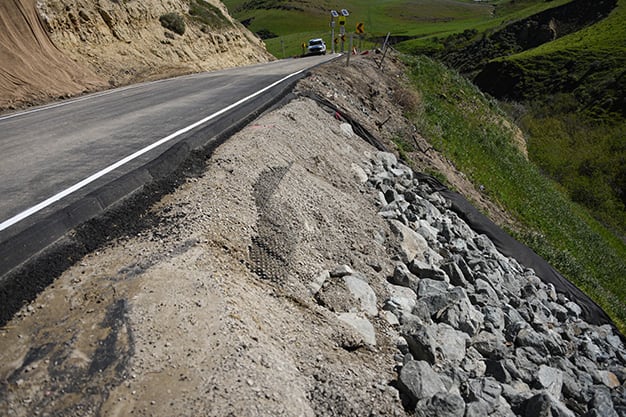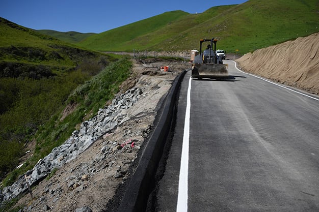 Patterson Pass had approximately 30' of the roadway shoulder eroded away during heavy storms. The scope of work consisted on excavated out the eroded roadway embankment, install fabric reinforcement and placing Class II and Class V rock slope projection. After the slope was secured 70' of the roadway was paved and a new AC dike was added to help control runoff in future rain events The project geography and limits of repair required the use of specialty excavator with long reach capabilities. The steepness of the slope made access an issue and employees had to repel down when working at the bottom of the slope.