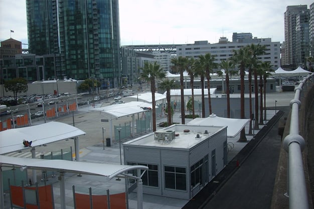 The temporary terminal for all transit bus services in San Francisco provides replacement bus facilities allowing demolition of the existing terminal and construction of the new Transbay Center.