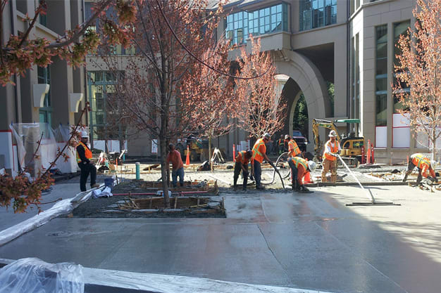 To ensure the proper growth of the 12 new Maple trees yet provide the required support for the cast and stone paver surface, 600 Silva Cells were installed below grade and filled with planting soil. The Silva Cell system is modular pavement support system which enables use of large soil volumes to support tree growth, as well as provide powerful on-site storm water management through absorption, evapotranspiration, and interception.